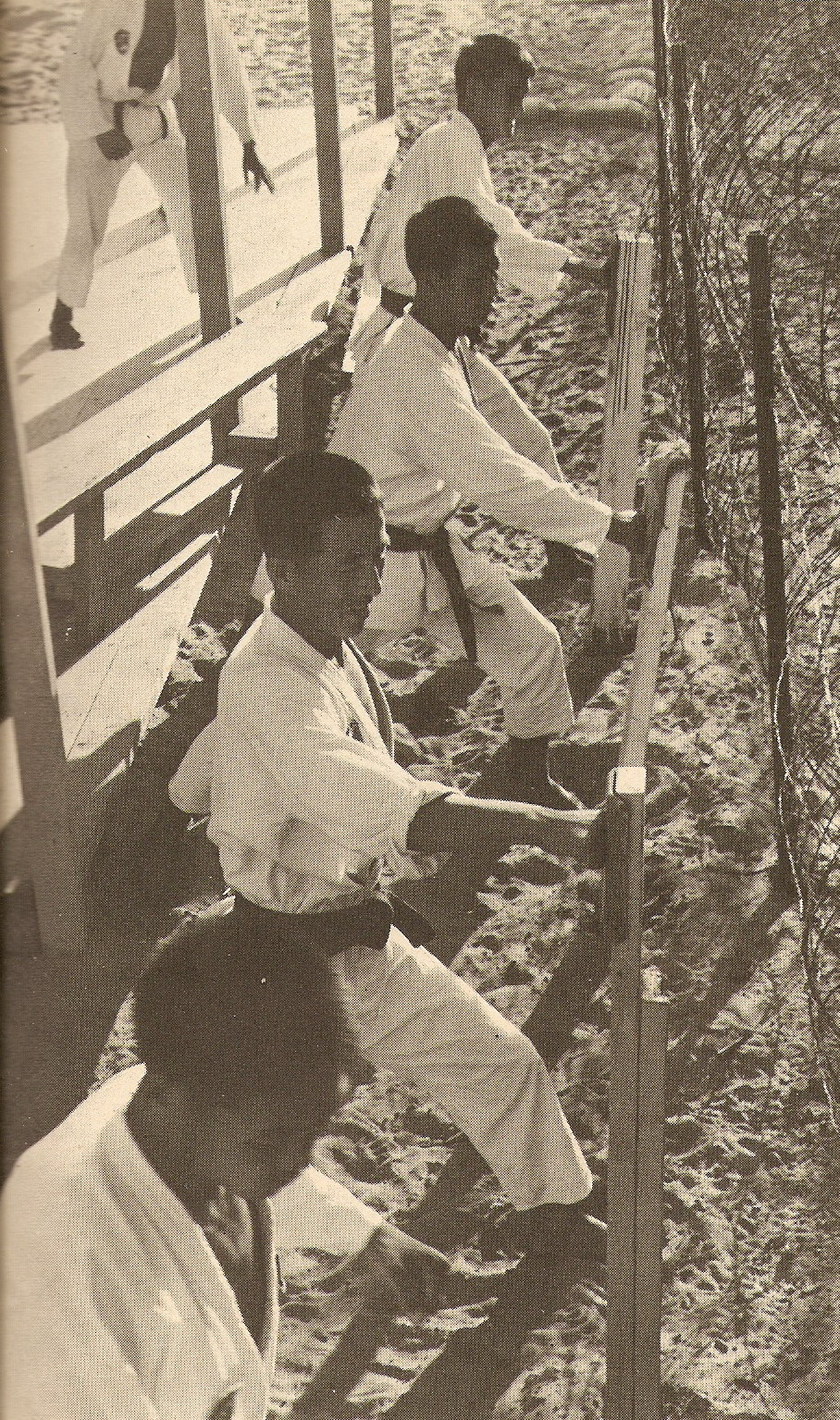 Tiger Troops working out on their own makiwaras, toughing the skin and accuracy for close hand combat, the specialy of the crack Korean Army division.